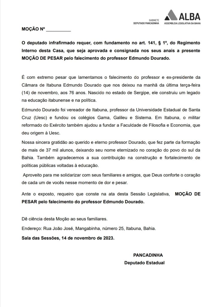 O parlamentar protocolou uma moção de pesar na Casa Legislativa Baiana para que fique registrado nos anais da Assembléia o falecimento de um dos grandes ícones da educação de Itabuna.