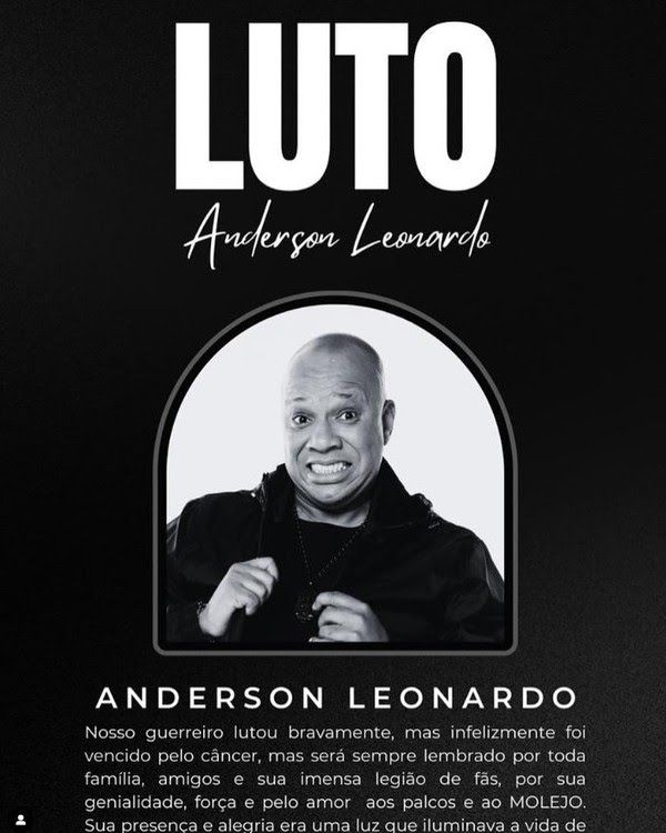 “Nosso guerreiro ANDERSON LEONARDO lutou bravamente, mas infelizmente foi vencido pelo câncer, mas será sempre lembrado por toda família, amigos e sua imensa legião de fãs, por sua genialidade, força e pelo amor aos palcos e ao MOLEJO. Sua presença e alegria era uma luz que iluminava a vida de todos ao seu redor, e sua falta será profundamente sentida e jamais esquecida, nós te amamos”, diz a mensagem postada em uma rede social.