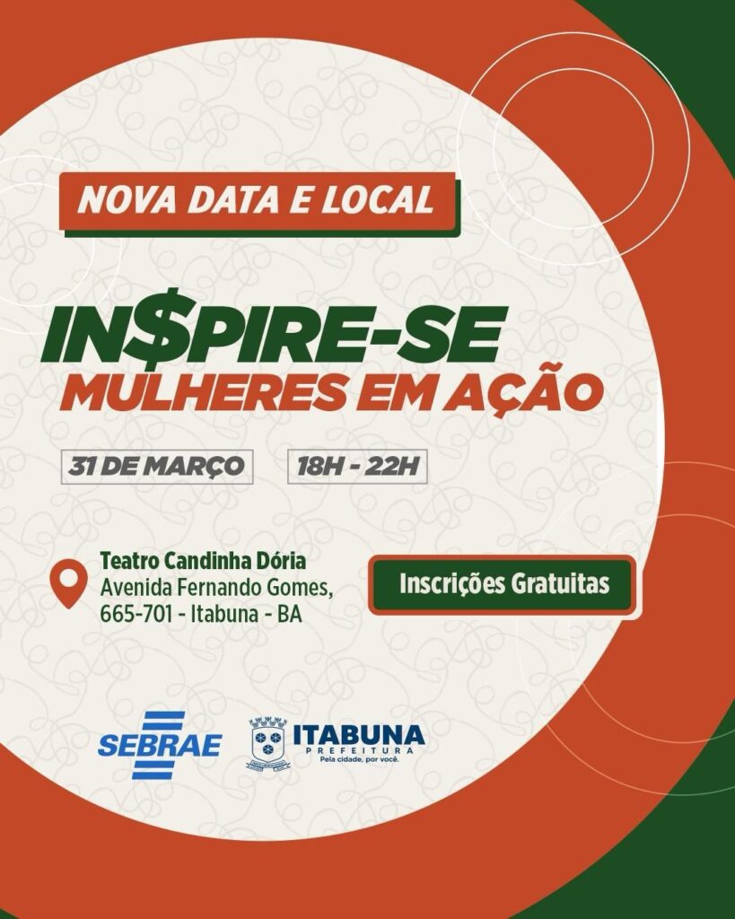 As inscrições gratuitas estão sendo feitas através do link: https://ba.loja.sebrae.com.br/inspire-se-mulher-itabuna-263753793