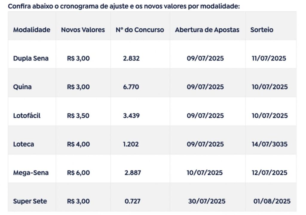 As apostas das Loterias Caixa aumentam de preços, a partir desta quarta-feira (9). O reajuste alcança as modalidades como a Dupla Sena, Quina, Lotofácil, Mega-Sena, Loteca e Super Sete.
